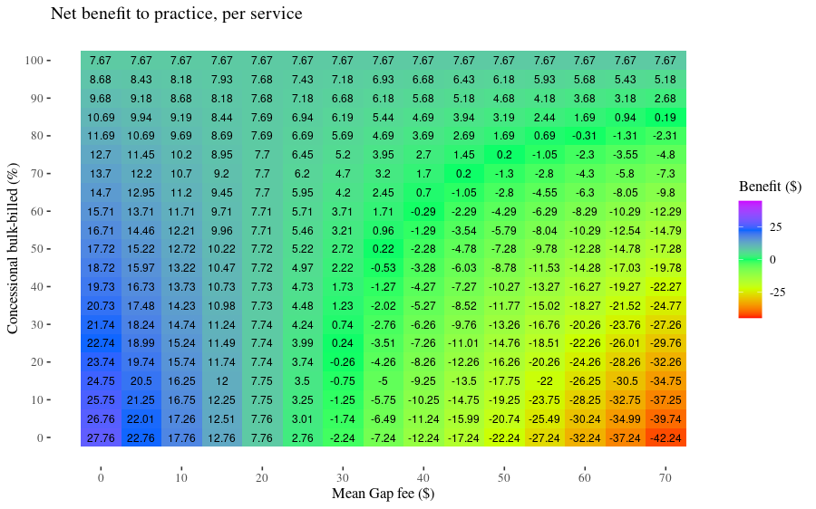 If you ‘Run Code’ the block below With the default settings of 50% of patients are concessionally bulk-billed and a mean gap fee of 50, the benefit-per-patient is shown as -7.84, i.e. a loss of $7.84 compared to the current mean fee of 87.76.