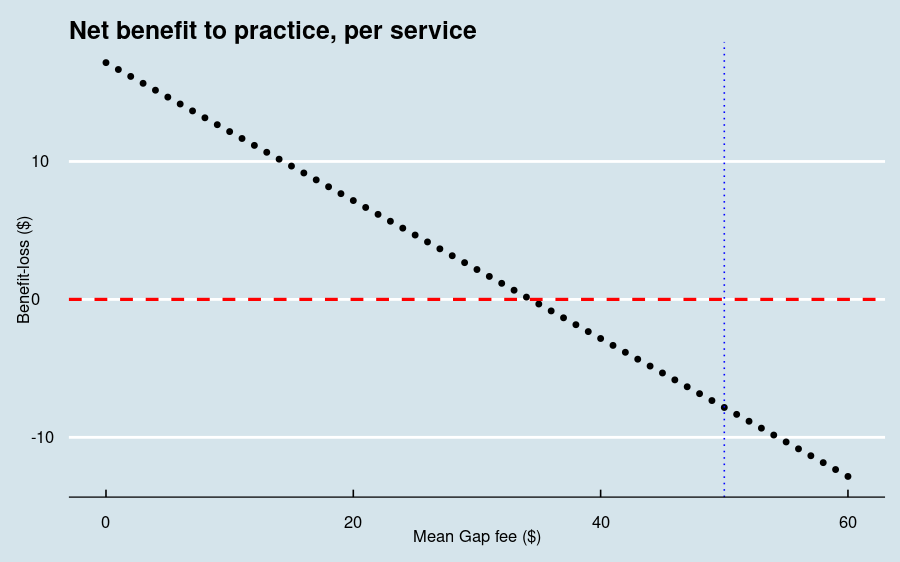 The above code chunk creates a plot like this, with a dashed red line at ‘zero’ benefit and a dotted blue line representing the current mean gap fee: