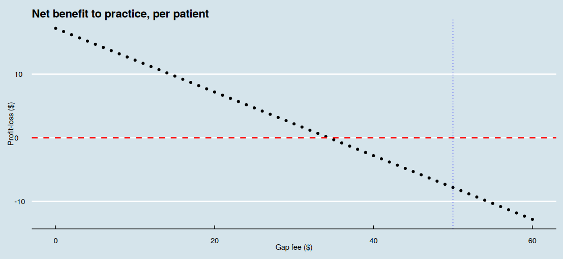 The above code chunk creates a plot like this, with a dashed red line at ‘zero’ profit and a dotted blue line representing the current gap fee: