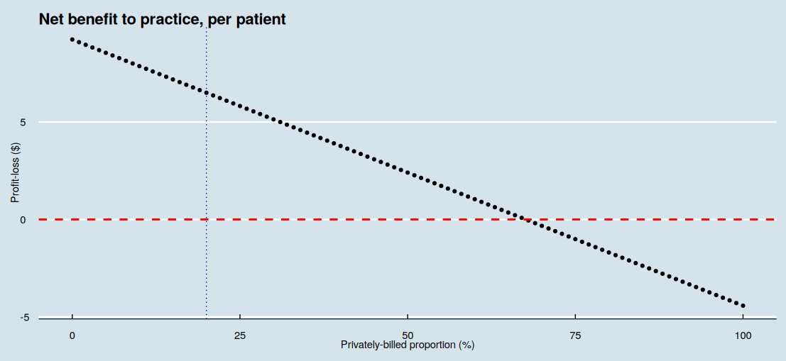 Likewise, we can examine the effect on net benefit through a range of different proportion of patients being privately billed prior to adopting universal bulk-billing. This graph is based on the second example.